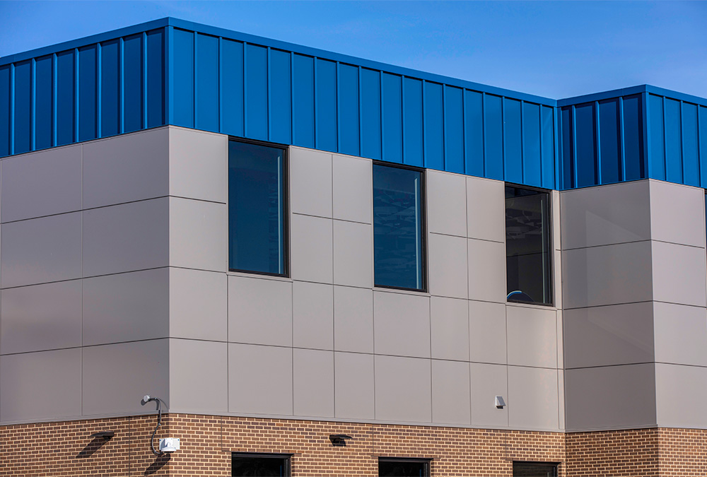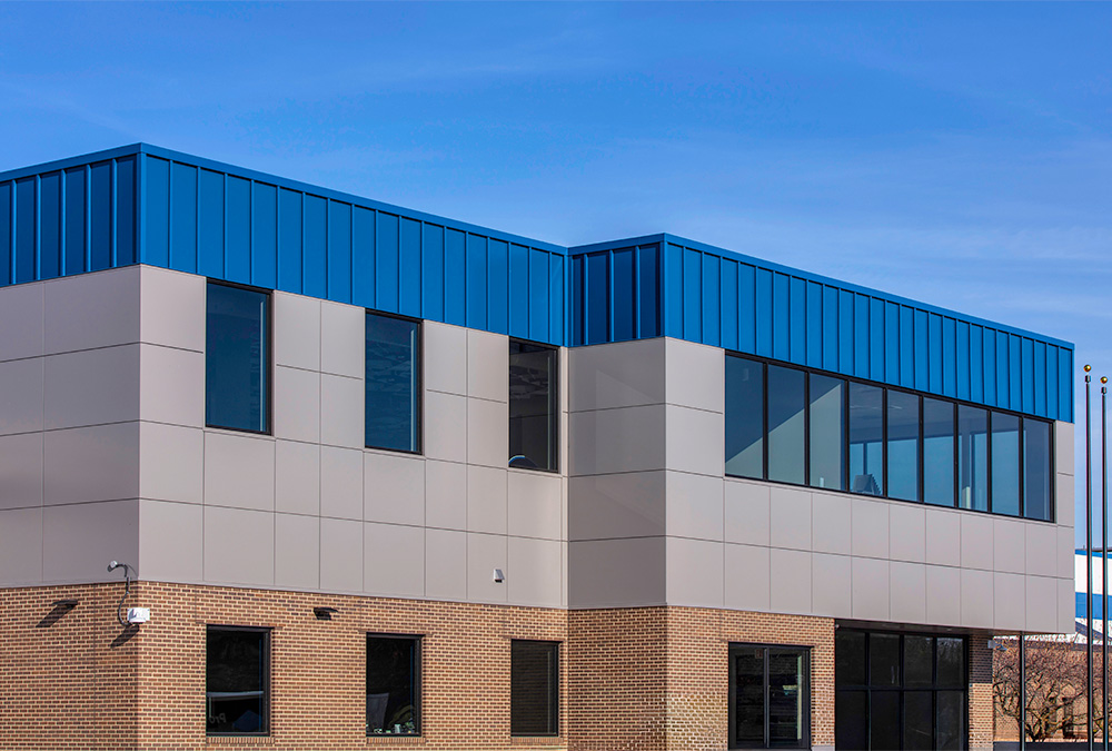 MUZA manufactured and installed 6,412 square feet of exterior product on this project, completed over roughly two months, where integrated materials deliver a bold, cohesive palette and a clean, modern MUZA’s Colors of Innovation finish.