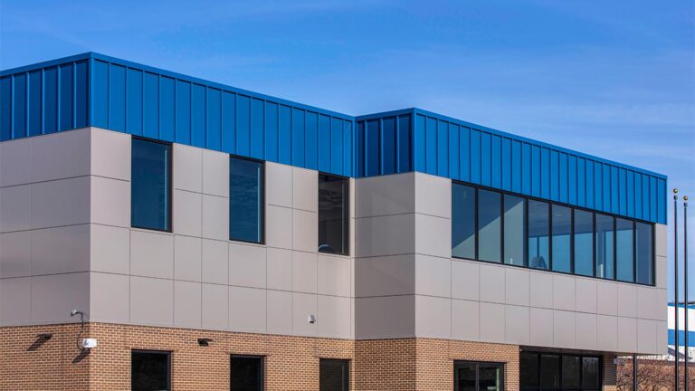 North End C is a mixed use building with residence on the upper floors and retail at the street level located in Milwaukee near the Bucks new stadium. The building is clad from top to bottom with single skin, fiber cement, composite and soffit panels. The single skin is an exposed fastener McElroy 24ga Mini Rib panel in a bone white, patricia bronze and a custom jute brown paint finish. The fiber cement is a Nichiha panel in an exotic red, peacock, cedar, and bark finish. The soffit is 12” flush panel in a color to match the fascia.